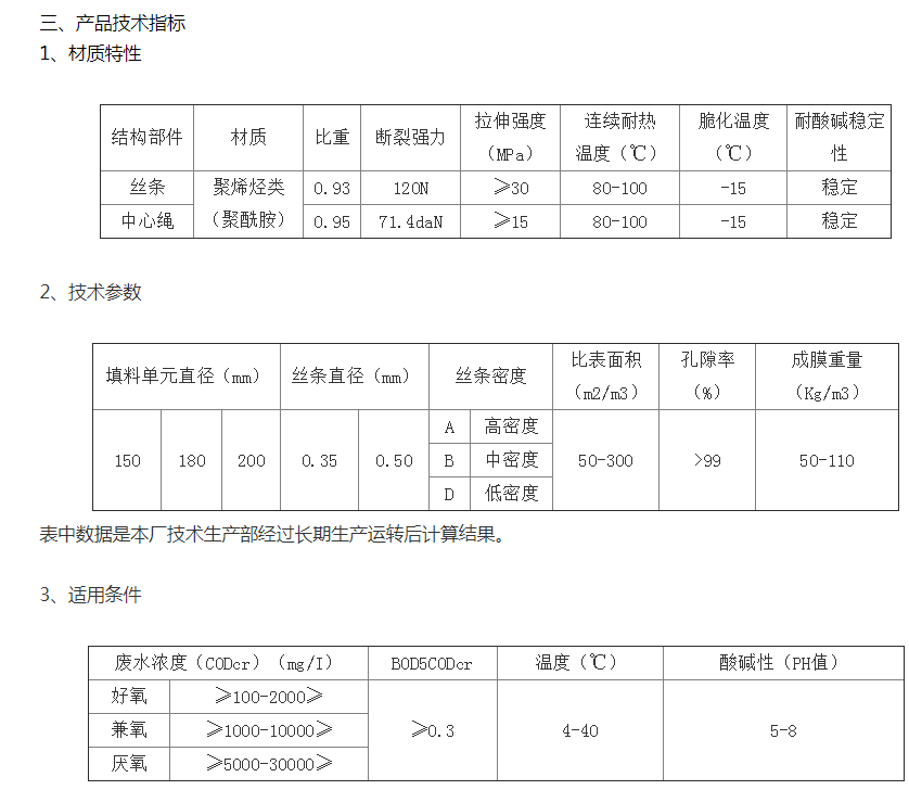 該填料篩選了聚烯烴類(lèi)和聚酰胺中的幾種耐腐、耐溫、耐老化的品種,混合以親水、吸附、抗熱氧等助劑,采用特殊的拉絲,絲條制毛工藝,將絲條穿插固著(zhù)在耐腐、高強度的中心繩上,絲條布置應呈立體狀,絲條表面應有微波紋,由于選材和工藝配方精良,剛柔適度,使絲條呈立體均勻排列輻射狀態(tài),制成了懸掛式立體彈性填料的單體,填料在有效區域內能立體全方位均勻舒展滿(mǎn)布,使氣、水、生物膜得到充分混滲接觸交換,生物膜不僅能均勻地著(zhù)床在每一根絲條上,保持良好的活性和空隙可變性,而且能在運行過(guò)程中獲得愈來(lái)愈大的比表面積,又能進(jìn)行良好的新陳代謝,這一特征與現象是國內目前其他填料不可比擬的。